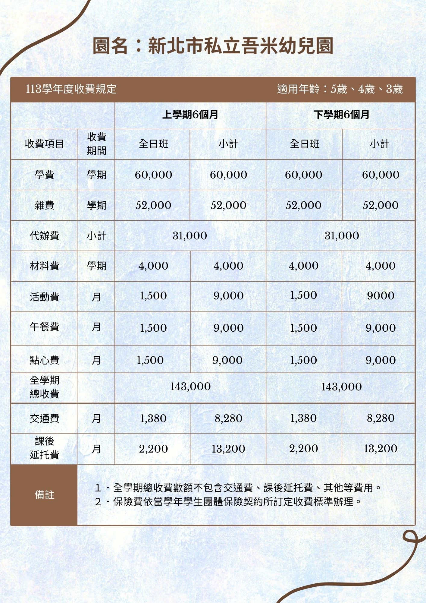 113學年度 第1學期 新北市淡水區私立吾米幼兒園收費規定