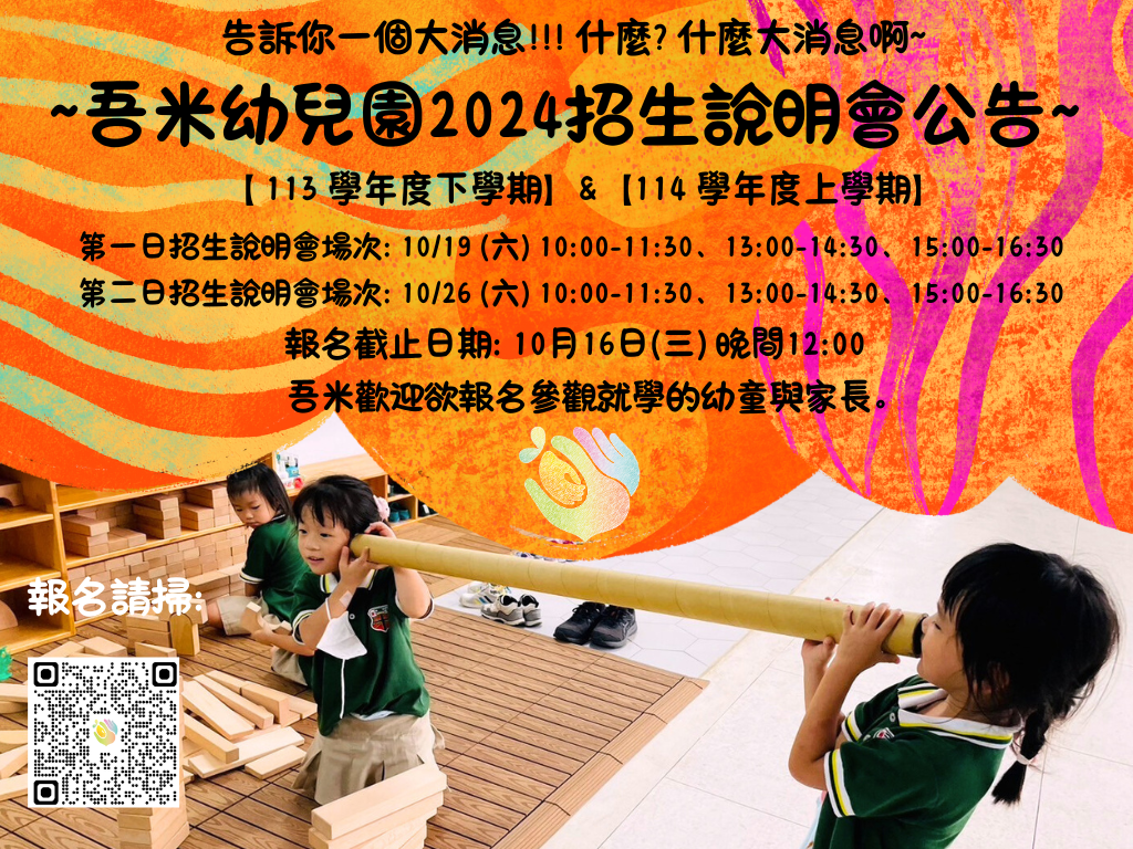 吾米幼兒園即將進行【 113 學年度下學期】及【114 學年度上學期】的招生說明。為了讓家長們更深入了解吾米幼兒園的教學理念、課程規劃、收費方式、環境建置等問題,誠摯邀請您們參與本年度的10月份招生說明會。