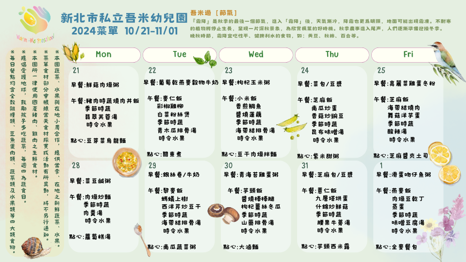 ※菜單食材部分會根據當天食材採買或活動有所異動,將不另行通知。