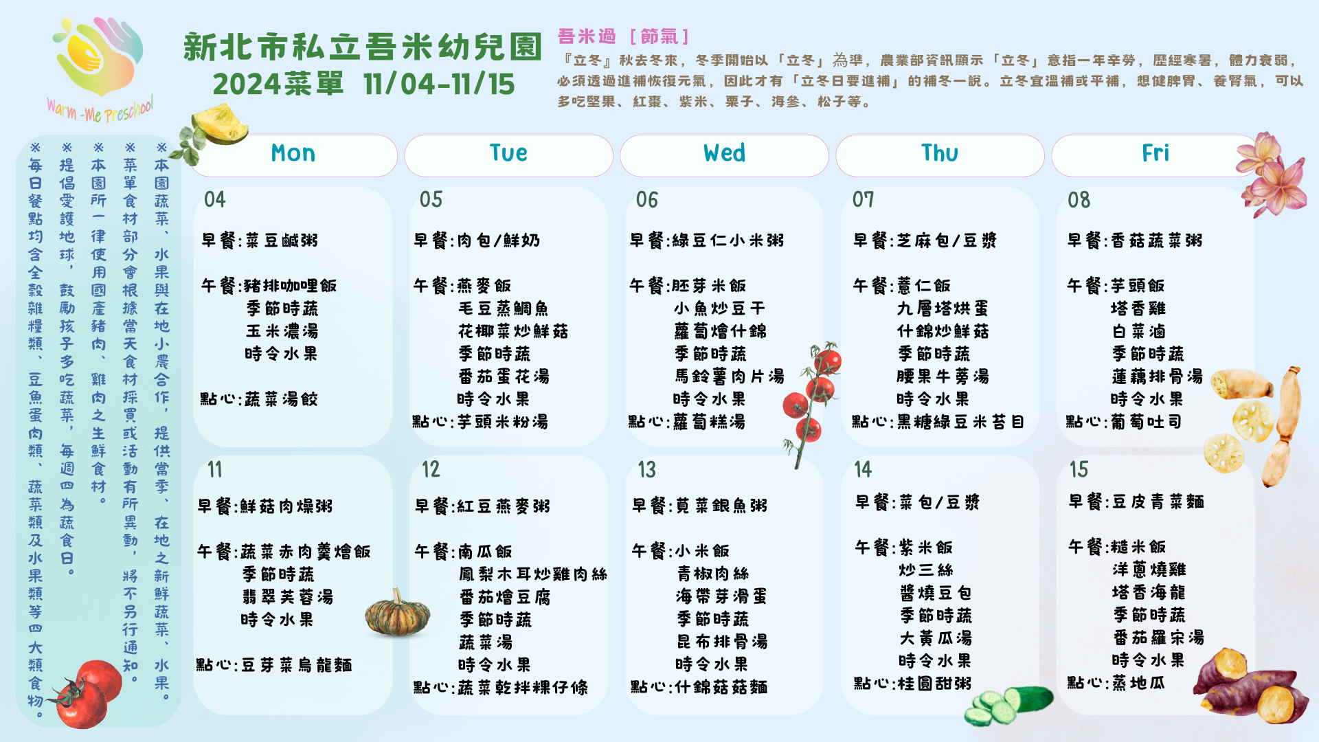 ※菜單食材部分會根據當天食材採買或活動有所異動,將不另行通知。