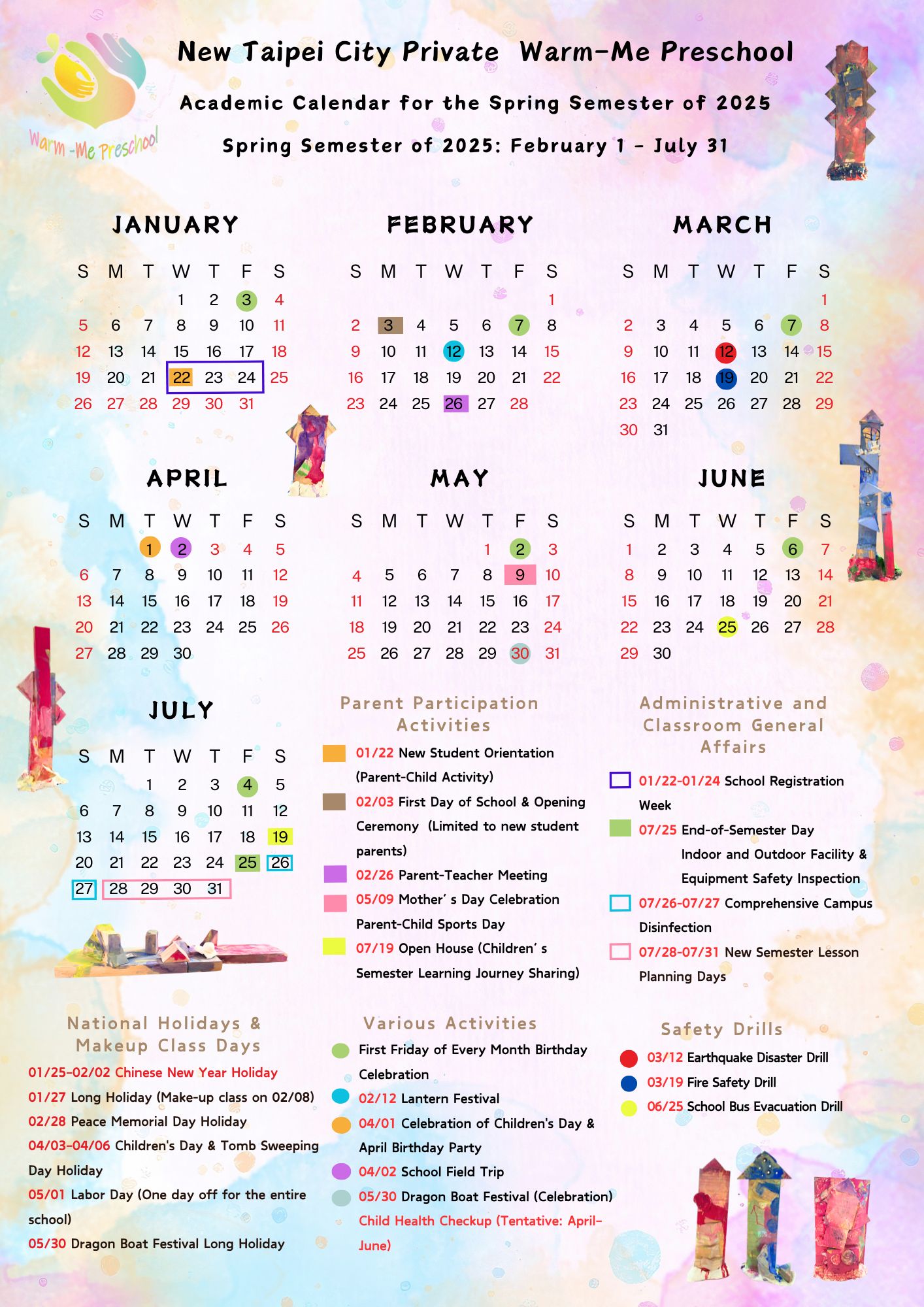 吾米幼兒園113學年度第二學期行事曆公告: Warm-Me Preschool Spring Semester of 2025 Academic Calendar Announcement: